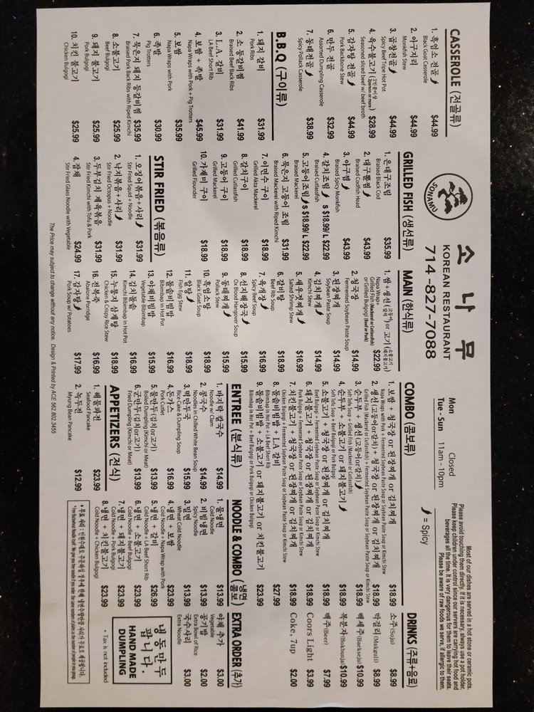 Sonamu, a Korean restaurant located in Anaheim, CA, offers a wide range of traditional Korean dishes with a modern twist. The restaurant provides a welcoming atmosphere with attentive service and a variety of amenities, including outdoor seating and a full bar. Customers have raved about the flavorful dishes, such as the hot pot, seafood pancake, and bibimbap, that showcase the chef's expertise and attention to detail. The menu also features unique side dishes and traditional favorites like kimchi, adding to the overall dining experience. With generous portion sizes and handcrafted dumplings, Sonamu ensures that guests leave satisfied and eager to return. A must-try for Korean food enthusiasts in the So Cal area, Sonamu stands out for its authenticity, quality, and friendly service.